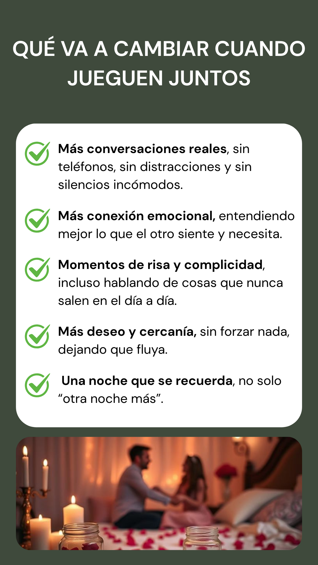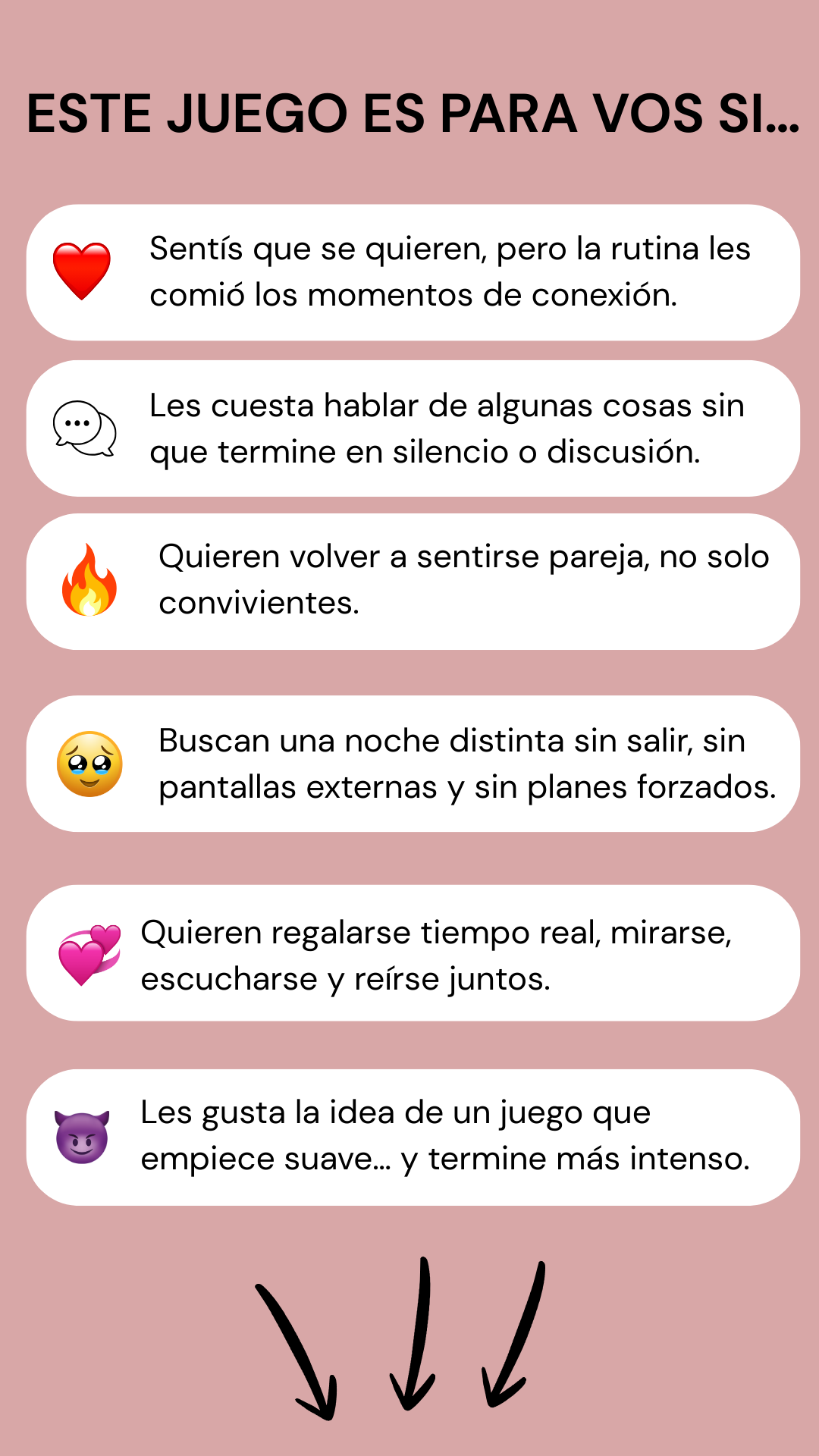 Es para parejas que se quieren, pero sienten que la rutina, el cansancio o el día a día les fue apagando los momentos de conexión.