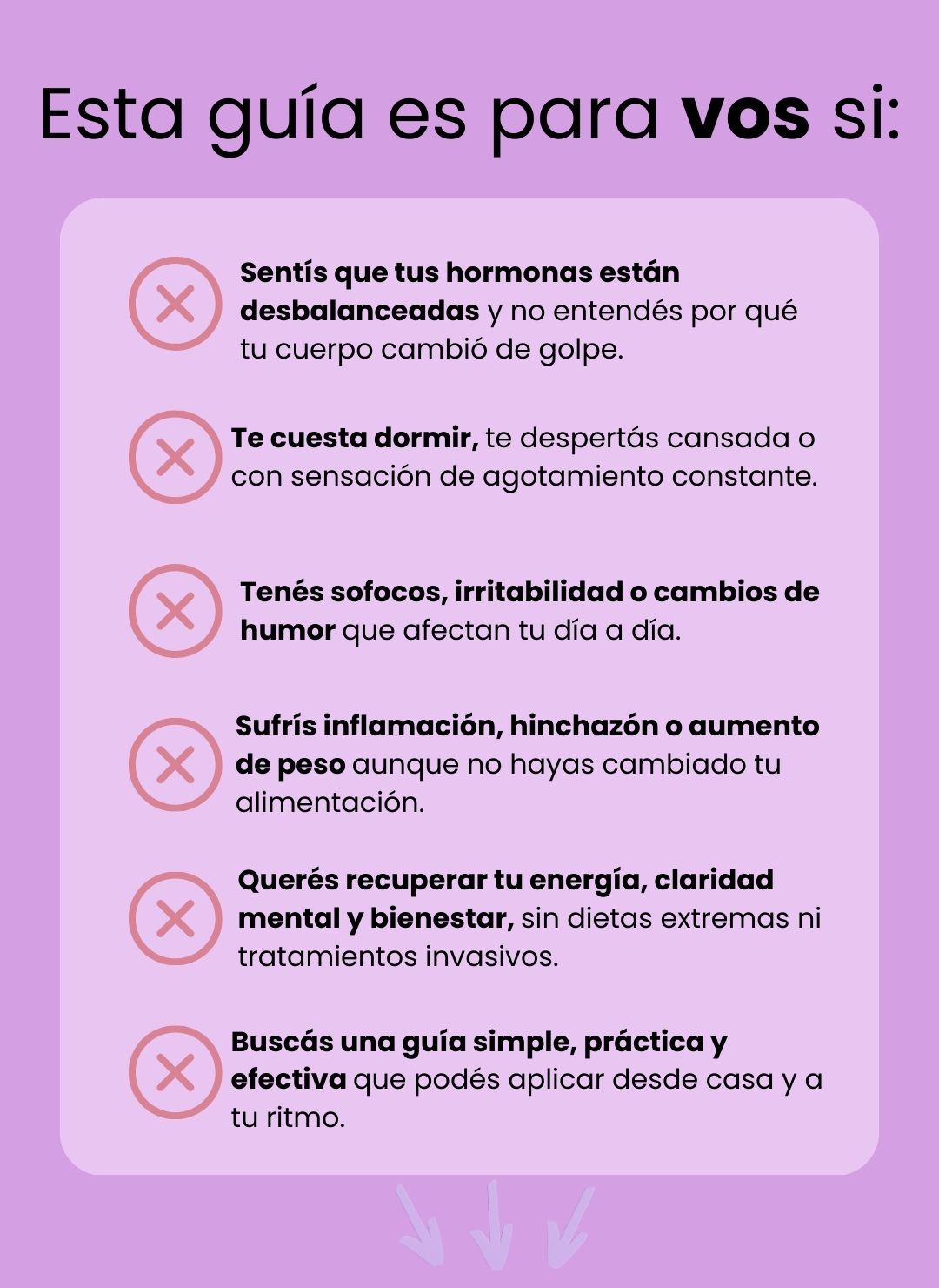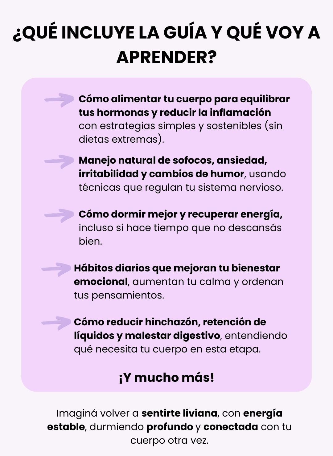 “La guía es hermosa, súper completa. Entendí mis síntomas por primera vez. Me ayudó a recuperar mi bienestar y sentirme en control nuevamente.”
