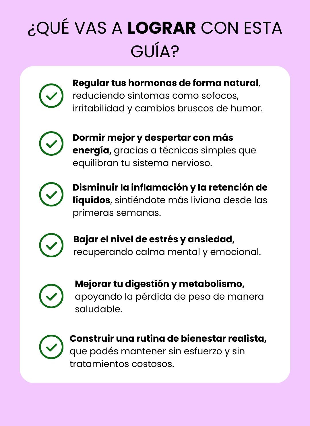 “Hace años no dormía bien. Con esta guía volví a descansar profundo y los sofocos bajaron muchísimo. Me siento más liviana y con otra energía.”